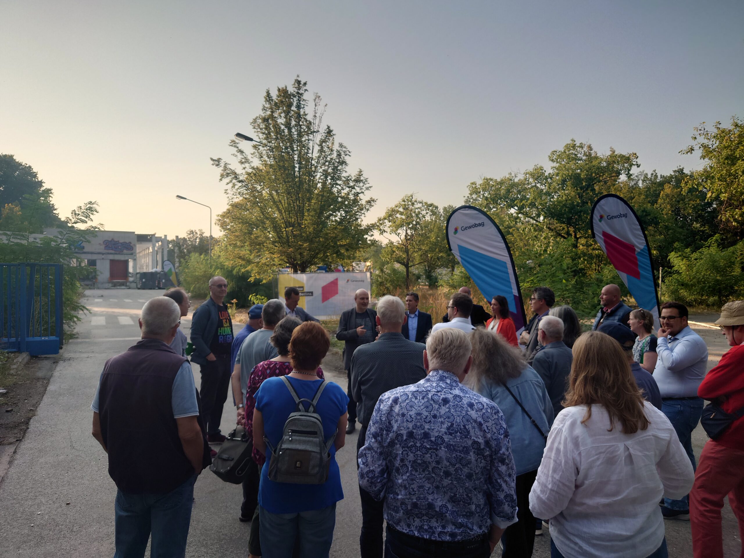 Mit einer Gruppe aus AnwohnerInnen und Fachpublikum haben wir das Baustellen-Gelände besichtigt. Stadtentwicklungssenator Christian Gaebler, die Vorstandsmitglieder der Gewobag, Malte Bädelt und Markus Terboven sowie weitere VertreterInnen der Gewobag und der Mundial AG informierten die Zuhörenden über das Entsiegeln des kompletten Gebietes, die kleinteilige barrierefreie Bauweise sowie die Überlegungen zum energetischen und zum Verkehrs-Konzept. Geplant sind bis zu 600 Wohnungen, die in Richtung S-Bahn etagenansteigend sein werden. Zur bewaldeten Uferzone hin wird es einen begrünten Zaun mit einer Aussichtsmöglichkeit geben. Mit der Baurechtschaffung wird bis Ende 2026 gerechnet, Baufertigstellung wäre dann 2029. Dieses große Bauvorhaben wird das Quartier aufwerten, in Nebengewerbeflächen können sich z.B. Ärzte niederlassen.