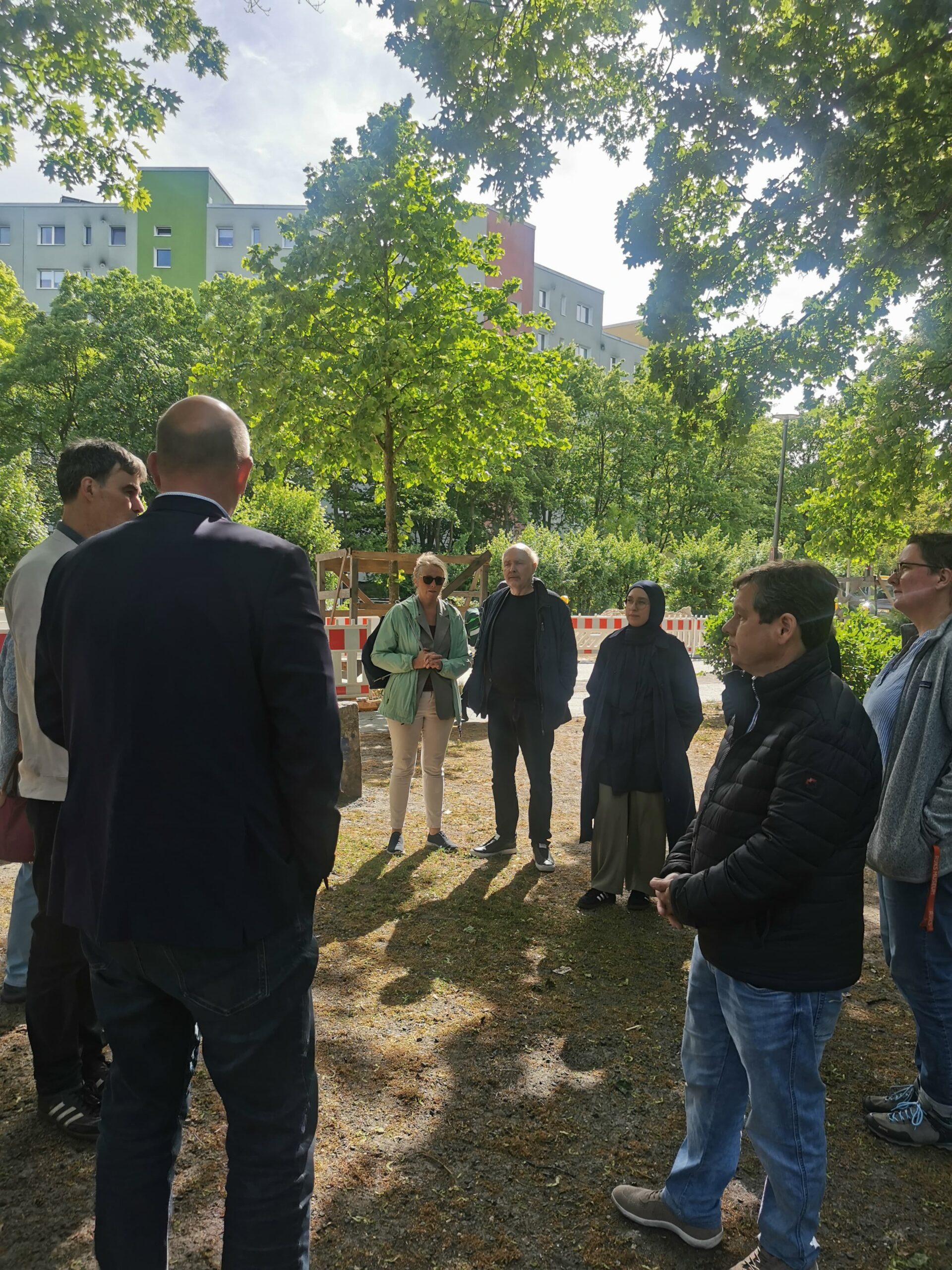 Regelmäßig und immer gern besuche ich dieses Gebiet, in dem 25.000 Menschen leben. Bei meinem jetzigen Besuch standen neue Wegeverbindungen, der Rosengarten und der Neubau des LAIV im Mittelpunkt. Beim Spaziergang entdeckte ich tatsächlich neue Wege und war beeindruckt von den zahlreichen Projekten, die gerade gleichzeitig laufen bzw. anlaufen. Der Rosengarten wird Mitte 2026 fertig, es wird einen Picknickhain und einen Bouleplatz geben, eine Pergola, Spielplätze und ein Hundeauslaufgebiet. Auch Obstbäume, Bänke und ein WC sind geplant. Aus dem LAIV wird bis Anfang 2026 ein Jugend- und Stadtteilzentrum, der Auguste Frauentreff wird durch den Ausbau des Dachgeschosses bis Ende 2026 erweitert. Unser Spaziergang führte auch zur Kirche der Katholischen Gemeinde St. Rita, denn dort gibt es einen barrierefreien Gemeinderaum mit Bühne, der für Veranstaltungen genutzt werden kann. Eigentlich fehlt in diesem Gebiet nur noch das KuBiZ, das geplante Kultur- und Bildungszentrum anstelle der jetzigen Stadtteilbibliothek. Es muss anteilig aus Bezirksmitteln finanziert werden, wäre schön, wenn es dafür noch Möglichkeiten gibt.